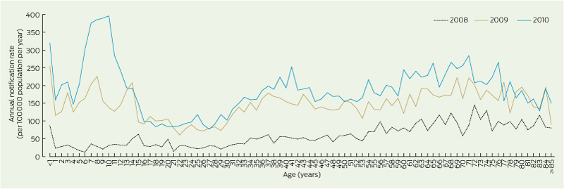 Increases in awareness, testing and detection of milder disease, and the possibility that the vaccine may be less effective against milder disease, may have resulted in decreases in VE estimates.24 It may be hypothesised that through differential health care use, older children may be less likely to have milder disease diagnosed, leading to relatively high and stable VE estimates. However, point VE estimates among older children were substantially lower in 2010 compared with 2009. Increased testing is likely to have contributed substantially to high notification rates during the epidemic. However, the high and increasing proportion of pertussis tests with a positive result between 2009 and 2010 in older children suggests that the disease burden was truly greatest and increasing in 2010 among children aged 6 – < 12 years, consistent with notification patterns and waning protection following a four- or five-dose acellular vaccine course. A likely consequence of increased pertussis incidence among older children is increased transmission, which will have the greatest impact on infants.