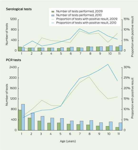 Two major Qld pathology providers — Pathology Queensland, the publicly funded laboratory service, and Sullivan Nicolaides Pathology, a private company — provided data on pertussis serological tests and PCR assays undertaken at their laboratories in 2009 and 2010 for Qld residents. These providers were responsible for about 40% of pertussis notifications in Qld during the study period. We did not include culture results to determine pertussis testing patterns because culture was performed infrequently and mostly on specimens also tested by PCR. We describe the numbers of serological and PCR tests, and the results of these tests, by age and year of test for children aged 1 – < 12 years.