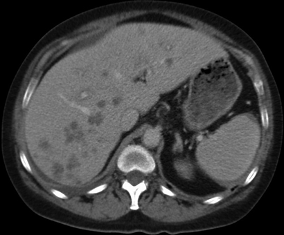 A 51-year-old woman was referred to hospital after an incidental finding of abnormal liver function test results (γ-glutamyl transpeptidase, 271 U/L [reference interval (RI), < 60 U/L]; alkaline phosphatase, 220 U/L [RI, 30–110 U/L]; hepatic transaminases, normal), acute renal impairment (urea, 11.7 mmol/L [RI, 2.7–8.0 mmol/L]; creatinine, 207 µmol/L [RI, 50–100 µmol/L]) and elevated globulin levels of 44 g/L (RI, 21–41 g/L). She was otherwise well and asymptomatic. Her past medical history included resistant hypertension with renal denervation 8 months earlier, and chronic macrocytic anaemia secondary to alcohol. Physical examination was largely unremarkable apart from several skin nodules and hepatomegaly (4 cm below the costal margin). She underwent an abdominal ultrasound, which showed multiple hypoechoic liver lesions suspicious for metastasis. An abdominal computed tomography (CT) scan (Box 1) confirmed the presence of hypovascular liver lesions suggestive of metastasis. Malignancy screening, including mammography, colonoscopy and CT of the chest, abdomen and pelvis, was negative. A subsequent liver biopsy specimen showed necrotising granulomas with no evidence of malignancy. The initial histopathological impression was of mycobacterial infection, despite negative Ziehl–Neelsen and Gram stains and the absence of infective organisms.