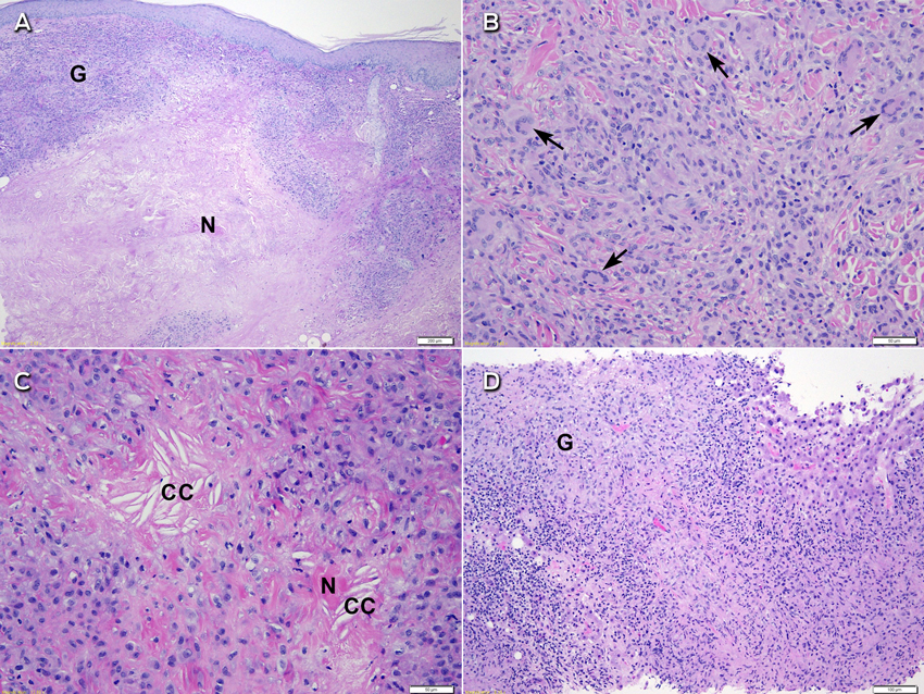 The biopsy specimens were reviewed for a second time for consideration of a non-infective aetiology. On the skin specimen (Box 3, B and C), in addition to scattered Langhans-type giant cells, several of the giant cells were more characteristic of Touton-type giant cells with a peripheral foamy cytoplasm. While necrosis was prominent, there were foci of necrobiosis with needle-shaped cholesterol clefts. Given the patient's clinical history, associated MGUS and characteristic histological features in the absence of any detectable infective aetiology, the lesions were in keeping with the diagnosis of necrobiotic xanthogranuloma.