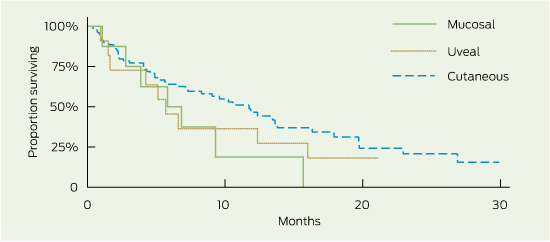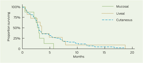 Although statistical significance is limited by the small number of patients with uveal (n = 11) and mucosal (n = 8) melanomas, there were some observed differences in survival data (Box 1) compared with the more prevalent cutaneous melanoma (n = 79). Trends demonstrated that future investigation of the shorter survival seen in the non-cutaneous subgroups may be warranted. The similar PFS but lower OS may reflect the different behaviour of the disease or the lack of subsequent treatment options compared with patients with cutaneous melanoma. The latter is unlikely in our patient cohort, where most patients (> 80%) with progressive disease following ipilimumab treatment were palliated (regardless of melanoma subtype) and not receiving subsequent therapy. Other explanatory factors may include the greater proportion of patients with uveal melanoma with widespread disease (M1c, 100%), and greater baseline tumour load (elevated LDH, 82%).