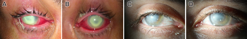 On examination, both contact lenses were still in situ and the patient had only light perception. There was conjunctival and ciliary injection, with peripheral thinning of both corneas, especially in the inferior areas (Figure, A and B). Both corneas were completely white and opaque, owing to dense corneal infiltrations involving the whole cornea. Subtotal epithelial defects were seen with 1.5 mm hypopyon in both eyes.