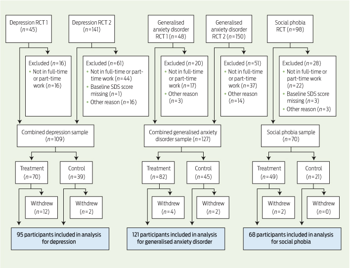 We used data from five RCTs conducted between 2008 and 2010 that established the efficacy of iCBT for depression (two trials, conducted from September 2008 to February 2009 and from June 2009 to January 2010),12,13 generalised anxiety disorder (two trials, conducted from March 2009 to June 2009 and from July 2009 to January 2010)14,15 and social phobia (one trial, conducted from May 2008 to July 2008).16 In each of these trials, participants were specifically asked about days absent from work (self-reported absenteeism). Data on reduced symptoms, presence of disorder and disability have previously been reported from these trials, but data on self-reported absenteeism have not. To ensure sufficient power to compare treatment effects across disorders, data from the two depression trials were combined, as were data from the two generalised anxiety disorder trials.