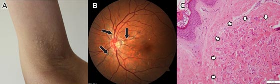 Physical examination revealed multiple pinhead-sized yellowish flat-topped papules on the skin of the axillae and lateral aspects of the neck (Figure, A). These lesions made us suspect pseudoxanthoma elasticum, so we performed a fundoscopic examination which showed obvious angioid streaks (Figure, B). A biopsy of the axillary lesions showed a band of degenerated clumps of elastic fibres (Figure, C) and calcium deposits in the upper reticular dermis.