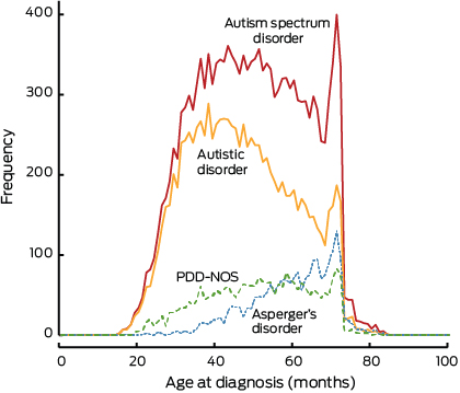 The average age at diagnosis of ASD between 1 July 2010 and 30 June 2012 in children aged under 7 years and registered with the HCWAP was 49 months. As shown in Box 1, children with autistic disorder were diagnosed 7 months earlier than children with pervasive developmental disorder — not otherwise specified (PDD-NOS) and 16 months earlier than children with Asperger's disorder (AspD) (χ2 = 1614.67; df = 2; P < 0.001; ɳ² = 0.11). Less than 3% of children with ASD were diagnosed by 24 months (Box 2). A clear spike in the frequency distribution of age at diagnosis was evident at 71 months (Box 3), indicating the most frequently reported age at diagnosis of ASD (under 7 years) nationwide in the HCWAP database.