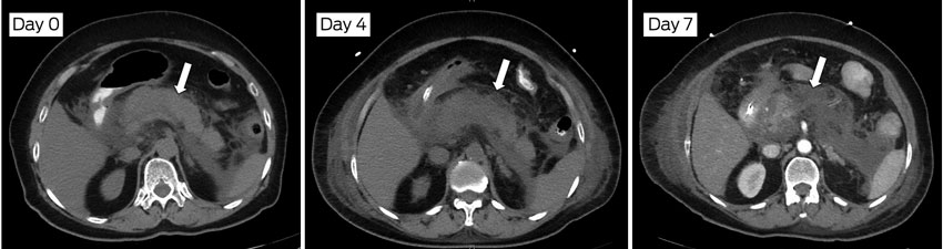 Routine use of CT scanning is not recommended in patients with a clear diagnosis of pancreatitis established by the presence of the first two criteria. CT scanning should be reserved for those whose condition fails to improve clinically after 5 days to assess the severity and extent of necrosis, as it is after this time interval that the presence and extent of pancreatic necrosis are most obvious (Box 2).9,10 The reason for not performing routine early CT scans is based on strong evidence that they do not improve clinical outcomes, increase the risk of contrast allergy and nephrotoxicity, and increase the duration of hospital stay.15,16