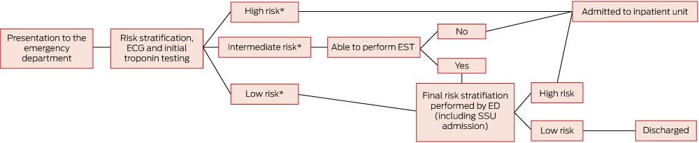 ECG = electrocardiography. EST =exercise stress test. ED = emergency department. SSU = short-stay unit. * Risk classifications according to the Queensland chest pathway (Appendix) based on the 2006 NHF/CSANZ guidelines.2