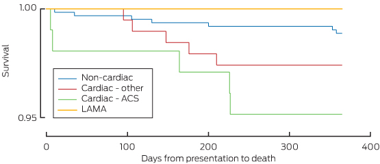 All patients were followed up at 30 days from presentation, and the death registry audit of survival at 1 year was done for patients who had consented; however, overseas deaths may have been missed. This is unlikely to be a significant number. All end points were adjudicated by cardiologists using available information. As such, the subcategories within the non-cardiac end points may not have the same diagnostic rigour as the cardiac end points. Non-cardiac investigations occurring away from the recruitment hospital were not obtained for outcome adjudication.