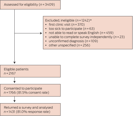 Of the 2167 eligible patients, 1431 returned a survey (Box 1). There were significant sex (χ2[1] = 12.3, P < 0.001; more women) and age differences (χ2[5] = 13.3, P = 0.02; more older patients) compared with those who withheld consent to participate. The age of those who initially consented but later did not respond could not be determined. Box 2 summarises the characteristics of the 1431 participants and the non-consenters.