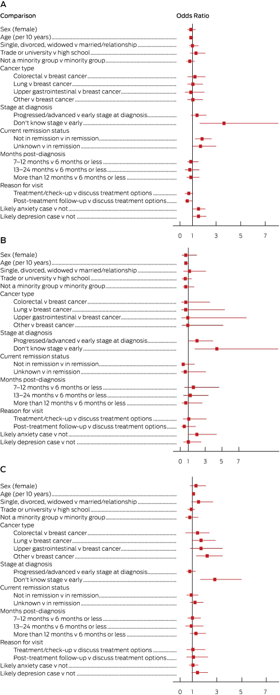 Previous studies of this question have been limited by convenience samples or low response rates (24% in one study5), or by including only participants with a single cancer type from a single treatment centre.4 The degree to which these data can be generalised to all cancer patients is therefore questionable. The literature indicates that patients’ preferences and experiences of prognosis discussions may vary according to their age, sex, marital status, ethnic background, education, disease status, time since diagnosis, cancer type and psychological wellbeing.4-6,15,16 Given the emphasis on reducing disparities in health care,1 it is important to explore factors associated with misalignment of patient preferences and experiences, and to identify subgroups who are less likely to receive the desired information.