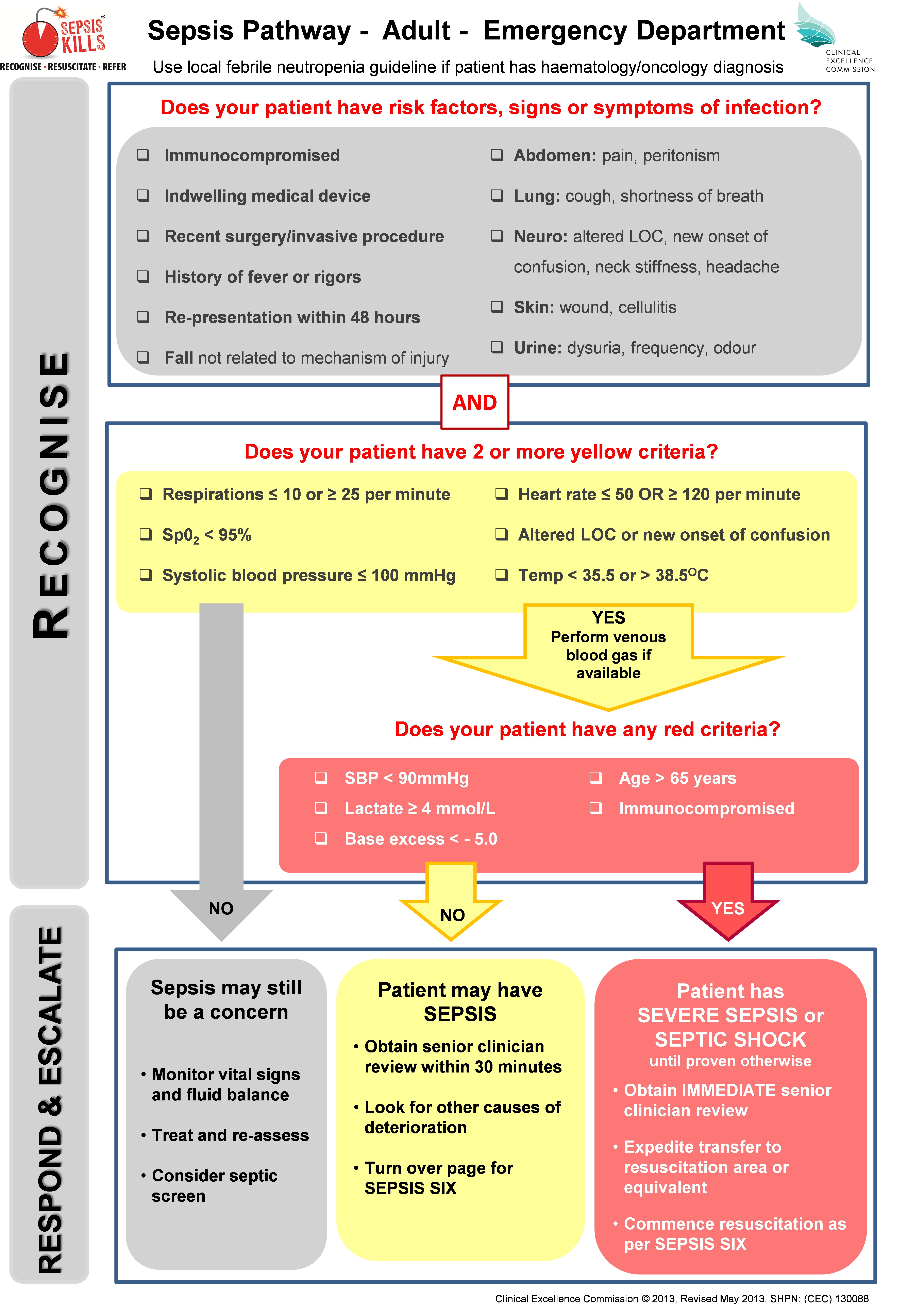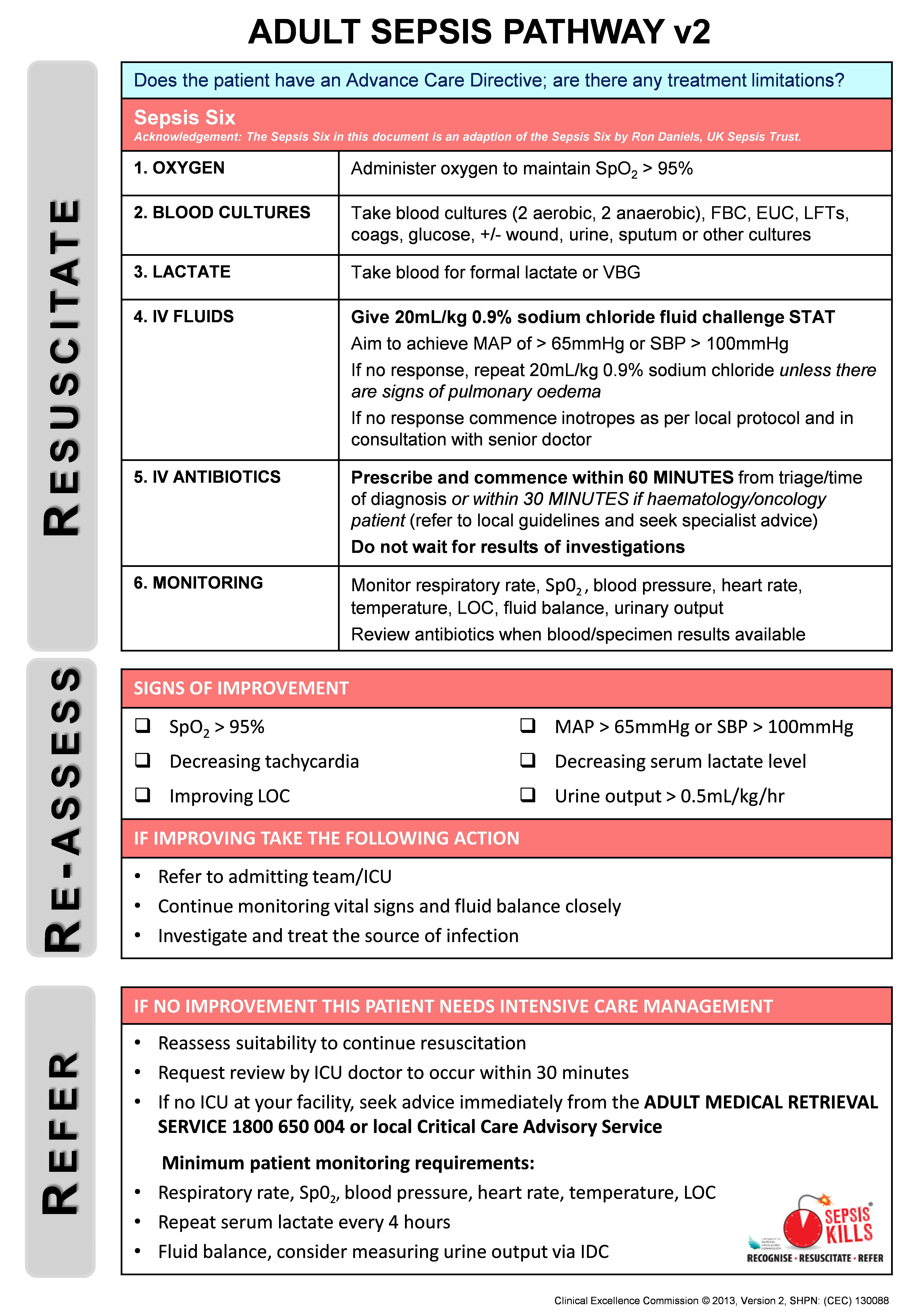 - 6. Clinical Excellence Commission. Recognition and management of sepsis (clinical focus report). Sydney: CEC, 2012. http://www.cec.health.nsw.gov.au/__data/assets/pdf_file/0004/259375/patient-safety-report-sepsis-2012.pdf (accessed Nov 2015).