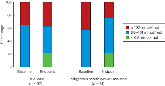 Participants: Indigenous adults with poorly controlled type 2 diabetes (HbA1c ≥ 69 mmol/mol) and at least one comorbidity (87 people in six IHW-supported communities (IHW-S); 106 in six usual care (UC) communities).