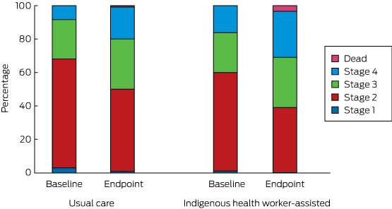 It is also worth reflecting on whether the theory underpinning the trial was correct. In expanding the capacity of IHWs to provide direct and intensive support for Indigenous patients in the community, through both outreach and centre-based care, it was hoped to achieve more effective management of chronic disease because of greater cultural awareness and by improving patient engagement in self-care. While some health gains were identified, the major psychosocial and economic problems that are typical for very disadvantaged populations, and the strong relationship between these factors and chronic disease, mean that it may be necessary to address these factors more directly.23 Most of the IHW-S communities are in the bottom 2% of Queensland communities in terms of socio-economic disadvantage, indicating an extreme level of deprivation, often combined with a range of further serious adverse conditions.24 We did not have data on major life stressors (such as early death of family and friends, involvement with the criminal justice or child protection systems) that affect physical health and, probably, diabetes control; these factors may have affected the intervention and control communities differently.
