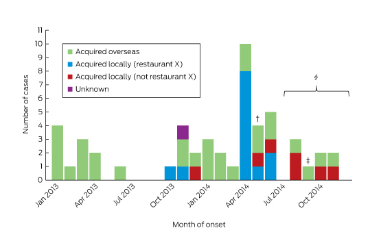 Between January 2013 and December 2014, 55 cases of HEV infection were notified (Box 1). The median age of the patients was 45 years (range, 4–77 years), 36 (65%) were male, and all but one (98%) lived in metropolitan Sydney. Twenty-four (44%) required hospitalisation, with a reported median length of stay (where known) of 7 days (range, 1–67 days). Three people (identified as co-diners of notified patients) were asymptomatic, and details about symptoms were unknown in one case. ALT levels were elevated in 33 of the 37 patients for whom they were recorded, with a median value of 1058 IU/L (range, 26–4868 IU/L; reference interval, 10–40 IU/L). None were pregnant.