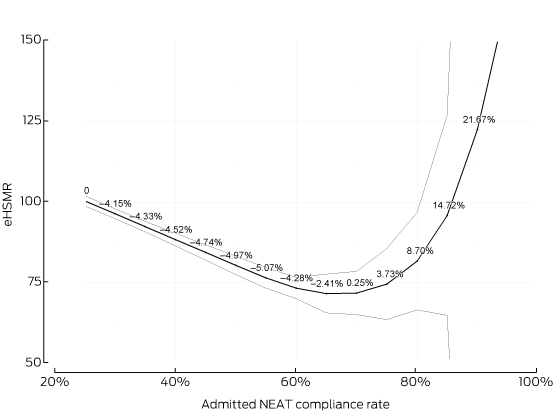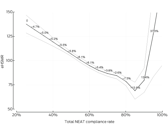Limitations of the study include the fact that this was an observational study. We identified a reduction in eHSMR as NEAT compliance rates increased to certain values, but this does not prove causality. However, the relationship was highly significant, even in sensitivity analyses that accounted for potential confounders, and we are unaware of any other national hospital quality and safety initiative implemented during the study period. Our omission of some hospitals limits the generalisability of our findings to all institutions. As the primary outcome measure, the eHSMR does not encompass other outcomes important to patients, such as morbidity or quality of life. Further, the use of HSMRs as the basis for cross-sectional, inter-hospital comparisons is controversial.21 Our final models cannot account for errors associated with estimating HSMRs; the denominator is estimated by modelling, and will therefore be imprecise.19 However, the HSMR is objective, accepted as a national measure,4 and serves as a useful indicator of potentially avoidable mortality within individual hospitals when tracked over time, provided there are no major changes in coding practices or admission policies; this applied to our study.21 Finally, the 95% confidence intervals around the mean eHSMR values corresponding to higher NEAT compliance rates broadened as the number of hospitals achieving such rates decreased, so that it is possible that mortality may further decline at higher NEAT compliance rates.