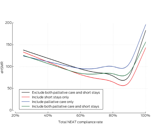 The aims of our study were to explore the relationship between eHSMR and NEAT compliance rates using a large dataset from several Australian hospitals, and to assess the effects on this relationship of potential confounding by the inclusion of palliative care and short-stay patients.