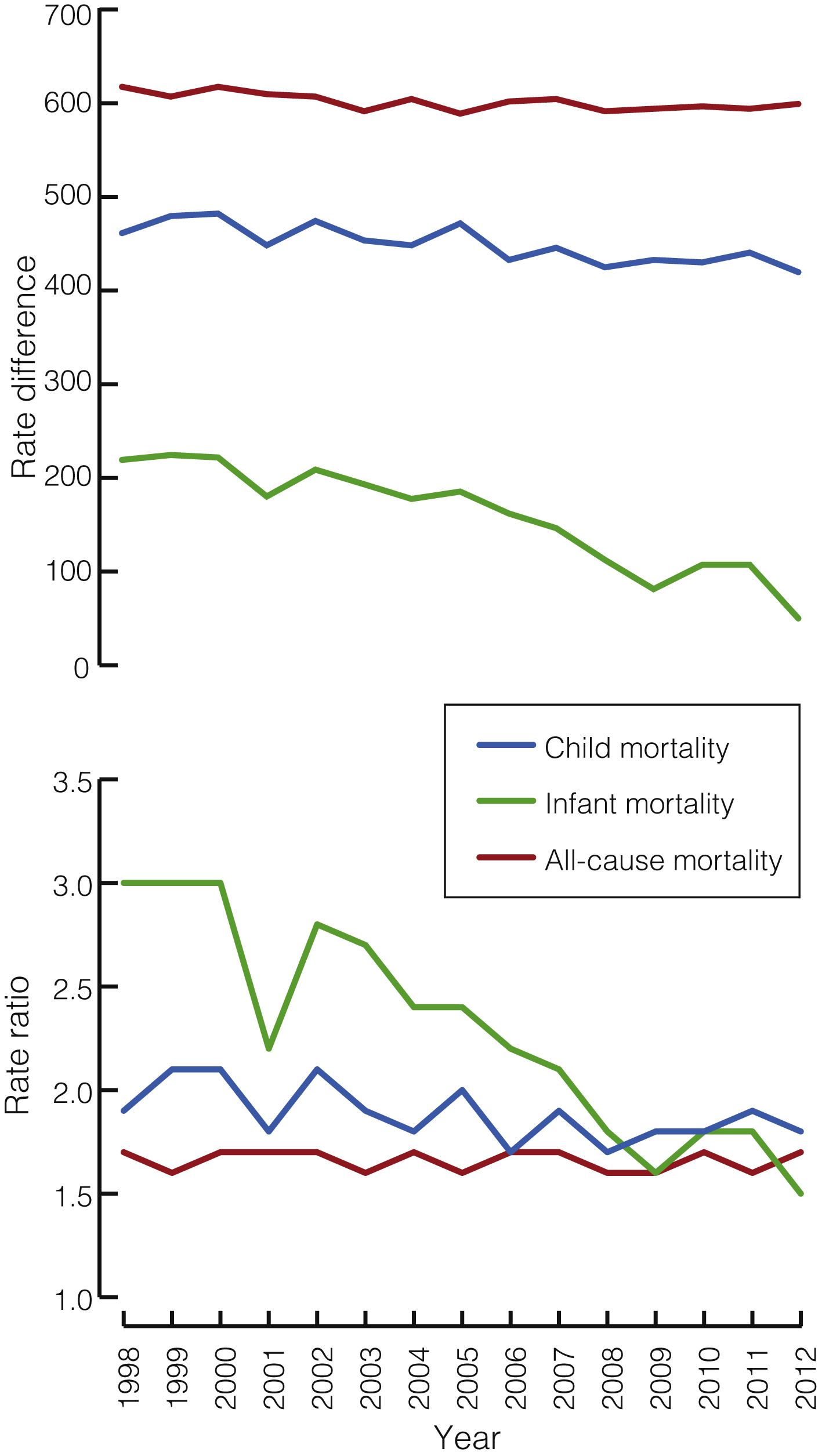 There have been significant declines in the all-cause mortality rate for both Indigenous and non-Indigenous Australians from 1998 to 2012 (of 13.2 and 7.5 deaths per 100 000 per year respectively; both P < 0.001). The rate difference also declined significantly, by 5.8 deaths per 100 000 per year (P = 0.004). The rate ratio, however, did not decline significantly (P = 0.62), with Indigenous rates remaining about 70% higher than non-Indigenous rates throughout the period.