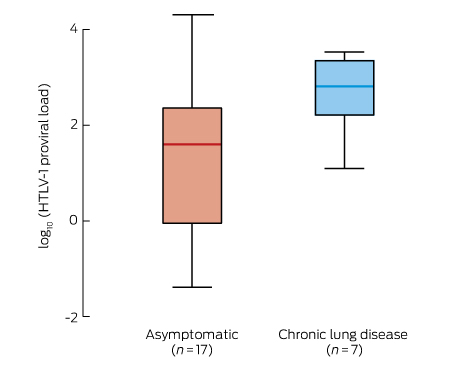 * Expressed as log10(HTLV-1 copies/105 peripheral blood leucocytes). Asymptomatic v chronic lung disease: P = 0.17 (Wilcoxon rank-sum test). Excluded from the analysis were three HTLV-1-positive participants who did not wait for clinical examination, two with symptomatic strongyloidiasis, and one for whom HTLV-1 PVL could not be determined for technical reasons.