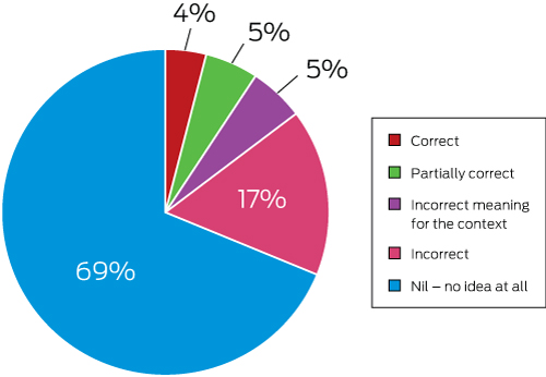 Data might suggest that only a small proportion (less than 10%) of Indigenous adults under 60 years do not speak English well, and that communication issues would therefore not be significant (Box 1). However, while many speakers of Indigenous languages living in remote areas can engage with outsiders and converse in English about everyday matters, they often have a poor grasp of English when it comes to health communications and other specialised areas. In a study on comprehension of 30 common legal terms (assault, bail, guilty, warrant, etc),11 200 Yolŋu people (north-east Arnhem Land) were surveyed with over 95% unable to correctly identify the meaning of these terms (Box 2). A parallel health study has not been conducted, but it is likely that understanding of common specialised health terms would be no better. Personal experience supports this view. In 1990, I taught a short course in medical interpreting to a group of Yolŋu students. In teaching the difference between idiomatic and literal language, I introduced an example (“He chucked his guts up”) that I thought everyone would understand. The Yolŋu students interpreted this idiom literally, thinking he ripped out his intestines and threw them in the air. Even simple little things that might be said, such as “let’s keep an eye on it”, can be baffling, because these expressions are often taken literally.