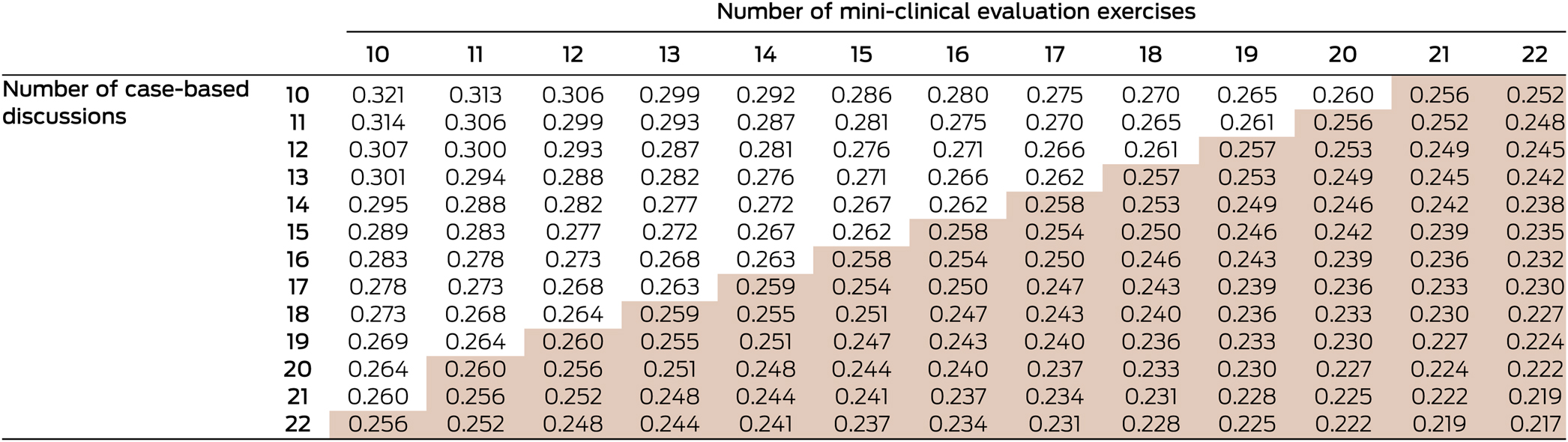 Box 3 – Composite reliability for combinations of mini-clinical evaluation exercises and case-based discussion assessments, with optimised weights