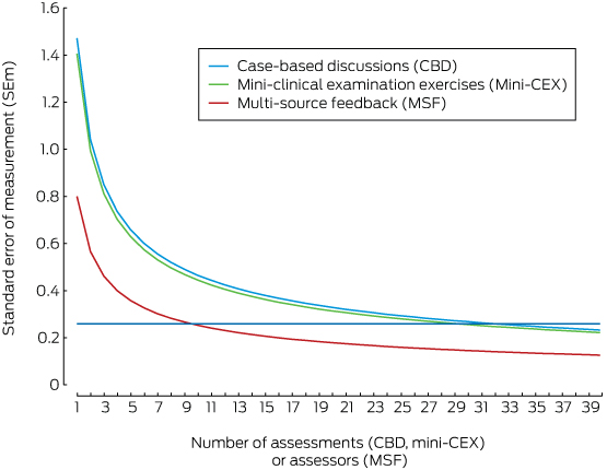 If six MSF assessments on one occasion were added to the five CBD and 12 mini-CEX assessments, the SEM improved to 0.24. By applying the harmonic means in Box 1 — that is, assuming that the IMGs underwent seven CBD, 12 mini-CEX and one set of seven MSF assessments with optimised weighting14 — a satisfactory SEM of 0.23 was achieved (Box 4).