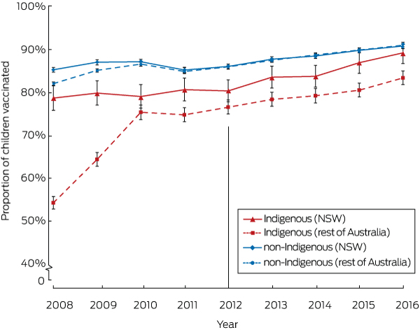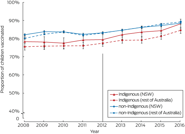 Annual vaccination coverage estimates between 2008 and 2016 were calculated for Indigenous and non-Indigenous children in NSW and the rest of Australia from Australian Immunisation Register data (status: 30 September 2017). The Australian Immunisation Register, a national whole-of-life vaccination register, is a nearly complete population register; all persons registered with Medicare have a record with the register.9 As the completeness of Indigenous identification in the register increased substantially after 2005,10 the 1% of children whose Indigenous status was not specified were deemed to be non-Indigenous for the purposes of our analysis.