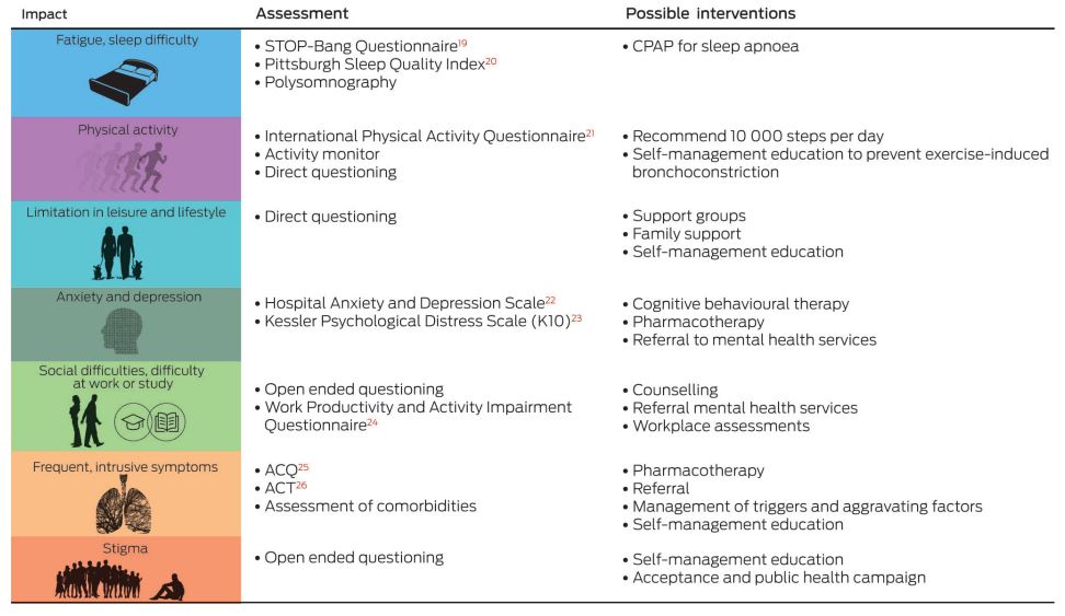 Our understanding of the impact of severe asthma on individuals’ lives — an area that was previously poorly explored — has recently expanded through qualitative research. An Australian study involving qualitative interviews with 25 people with severe asthma describes the impact of the disease and why it contributes such a major burden.4 In this study, four themes emerged from the data, including the “body as a hindrance”, the “burden of treatment”, being “alone with asthma” and “striving to adapt”. In describing the impact of her disease, a 54-year-old woman states: “I have lost in every facet of my life … My earning capacity, my self-esteem, my sense of achievement, my relationships. You name it, it’s been there”.4 This highlights the all-encompassing nature of severe asthma.
