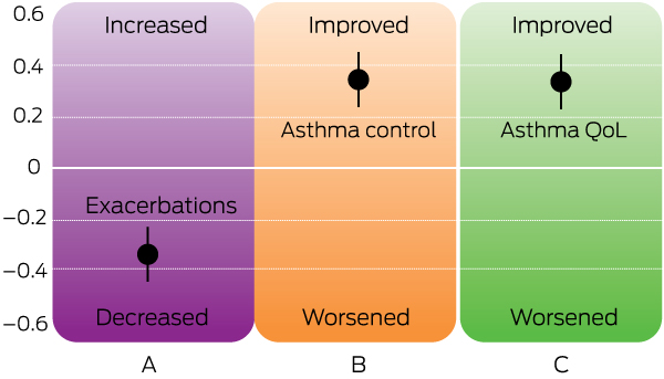 QoL = quality of life. * Bars represent standardised mean difference with 95% confidence intervals for exacerbations (A), asthma control (Asthma Control Questionnaire or Asthma Control Test) (B), and asthma-related quality of life (Asthma Quality of Life Questionnaire) (C), before and after multidimensional assessment and treatment. Positive effect size indicates an improvement in asthma control or asthma-related quality of life; negative effect size indicates a reduction in exacerbations. Source: The image has been adapted, with permission, from the Centre of Excellence in Severe Asthma.36