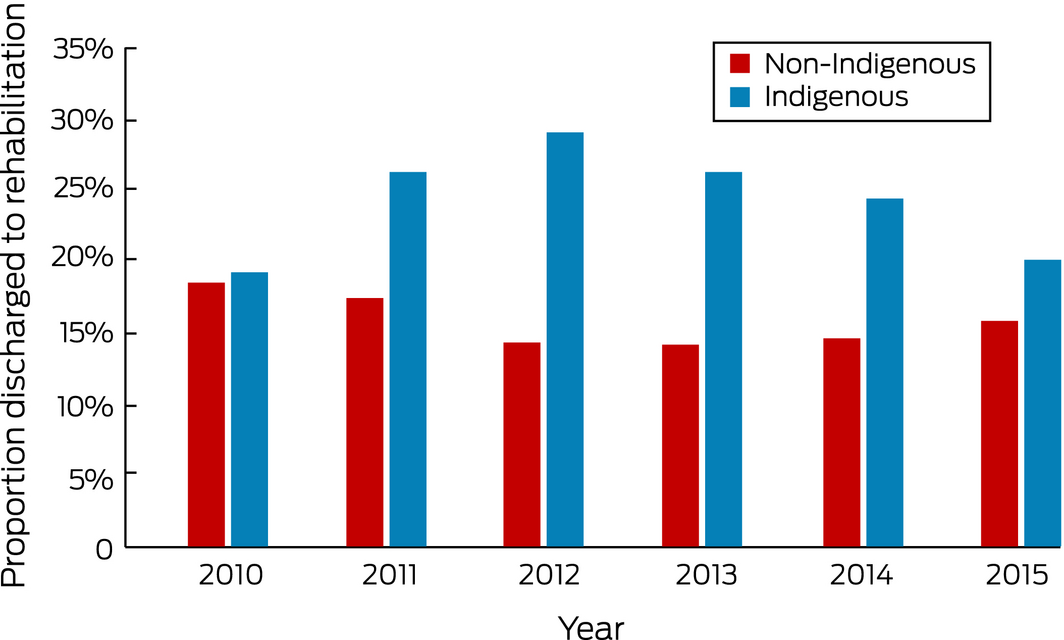 Major trauma can also cause patients significant functional impairment.24 The need for rehabilitation after discharge from hospital may indicate poorer functional outcomes. We found similar rates of discharge to rehabilitative facilities for Indigenous and non‐Indigenous patients. This contrasts with the findings of an investigation of discharge decisions for patients with traumatic brain injury, which found that Indigenous status was strongly associated with deciding to discharge patients to rehabilitation, possibly because of the remote location of many Indigenous communities and the lack of alternatives for ongoing care.25