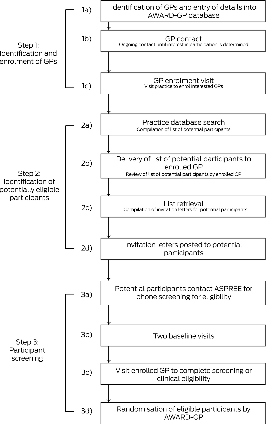 In Australia, general practice‐based recruitment was divided into three steps: identifying and enrolling GPs; identifying potentially eligible participants in general practice databases; and screening participants (Box 1; Supporting Information, table 1). To reduce time commitments and the burden for GPs, study staff were trained to undertake administrative tasks on their behalf, including searching databases, compiling lists, and sending invitation letters (Box 1, step 2). Additionally, practices were reimbursed for the use of their facilities with one‐time payments of $100 per randomised participant, and enrolled GPs who recruited randomised participants were recognised as co‐investigators.