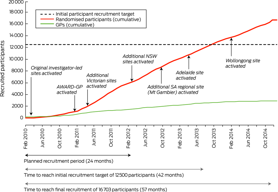 It was against this backdrop that the landmark Aspirin in Reducing Events in the Elderly (ASPREE) study was conducted in Australia and the United States.14 In Australia, participants were recruited through general practices with the ANBP2 strategy of enrolling GPs as co‐investigators. The initial Australian target of 12 500 participants was increased to 16 500 during the final stages of recruitment to offset lower than expected recruitment in the US. Overall, ASPREE enrolled 2717 Australian GPs, 2053 of whom facilitated the recruitment of 16 035 participants. An additional 668 participants, recruited directly from the community, increased the Australian total to 16 703 participants, exceeding the Australian recruitment target and providing a representative sample.14 In this article we outline and assess the factors that contributed to the successful recruitment of participants for ASPREE.
