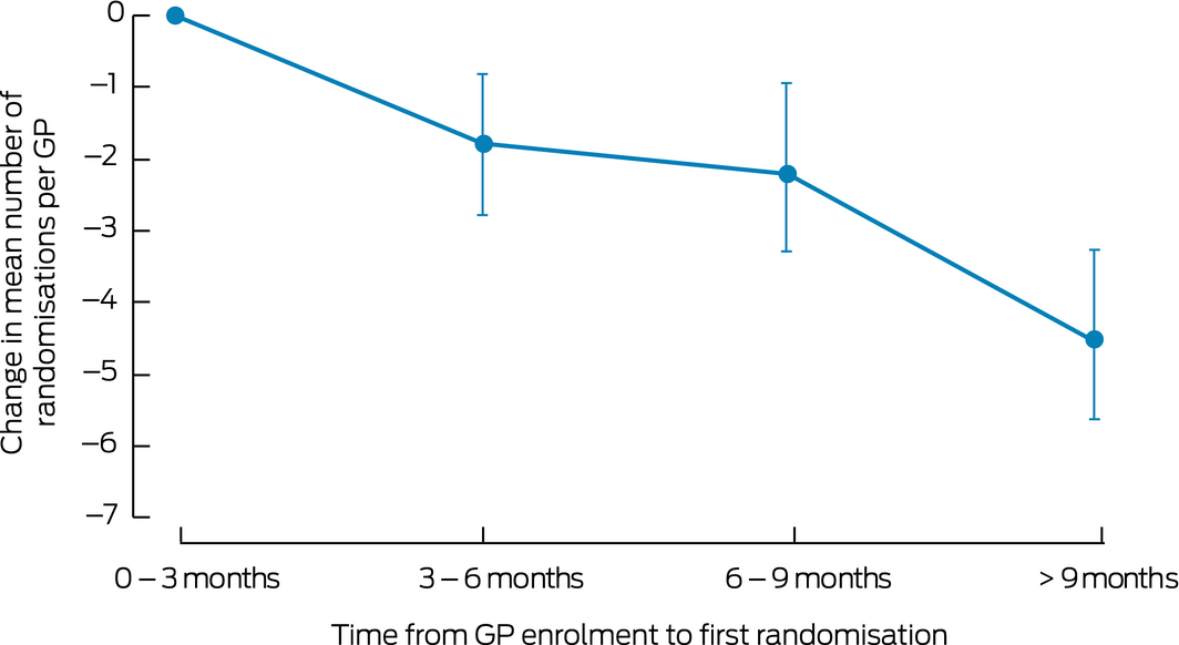 The mean number of randomised patients per GP decreased substantially with time to first randomisation. Compared with the reference group (0–3 months to first randomisation), the mean number of randomised patients per GP at 3–6 months was 1.8 (95% CI, 2.8–0.9), at 6–9 months 2.2 (95% CI, 3.3–1.0), and after 9 months 4.5 (95% CI, 5.8–3.4) fewer (each P < 0.001) (Box 5).