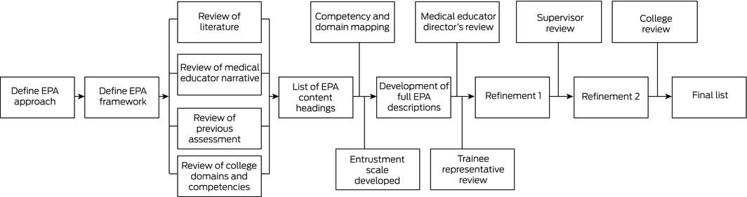 Published literature and guidelines informed the development of the 13 EPAs in the process summarised in Box 1.23 Overall competence comprises a number of specific competencies applied repeatedly and contemporaneously.24,25 By limiting the number of EPAs to 13 that encompassed broad responsibilities, we ensured their use would be practicable for supervisors and trainees, while still providing opportunities for specific feedback.8,24 EPA content headings were developed after a comprehensive review of the relevant literature and of domains and competencies of the curricula of the Royal Australian College of General Practitioners26 and the Australian College of Rural and Remote Medicine.27 Throughout the development process, key stakeholders, including supervisors, trainees, medical educators and college representatives, were consulted to ensure that published standards for content validation were met.23