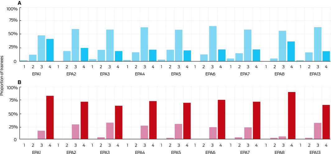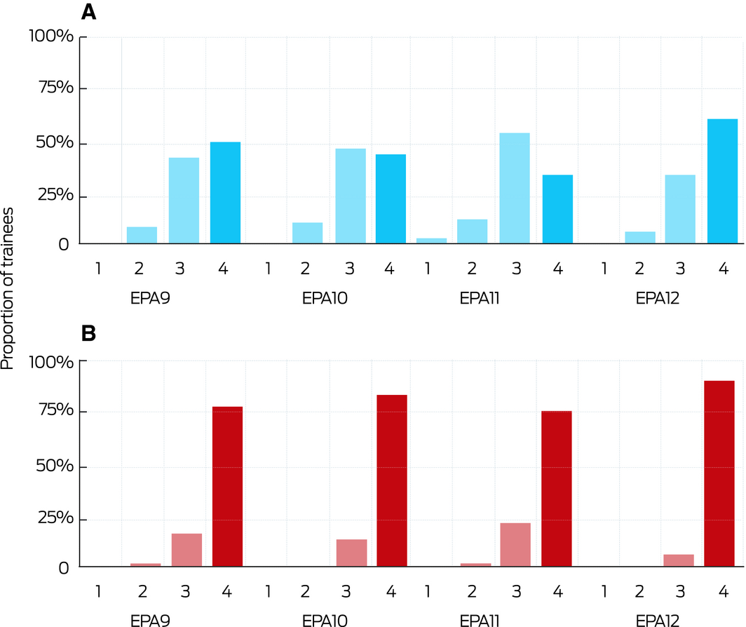 Box 4 – Supervisor‐determined levels of entrustment* for junior (A) and senior trainees (B) for clinical entrustable professional activities (EPAs) at 3‐month assessment