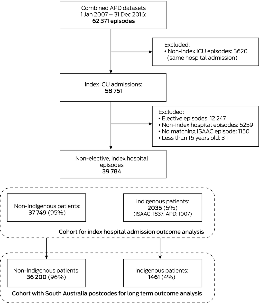 ICU episodes were excluded from our analysis if they were non‐index admissions (that is, repeat ICU episodes within a single hospital admission), planned elective admissions, or the patients were less than 16 years of age (and consequently unable to provide consent for medical procedures in SA). For our analysis of long term outcomes, the first non‐elective hospital encounter was included. Coding for Aboriginal or Torres Strait Islander status in the ISAAC dataset follows the ABS metadata standard for defining Indigenous status;18 patients were deemed to be Indigenous if the Indigenous status field in either the APD or ISAAC datasets recorded this as their status.