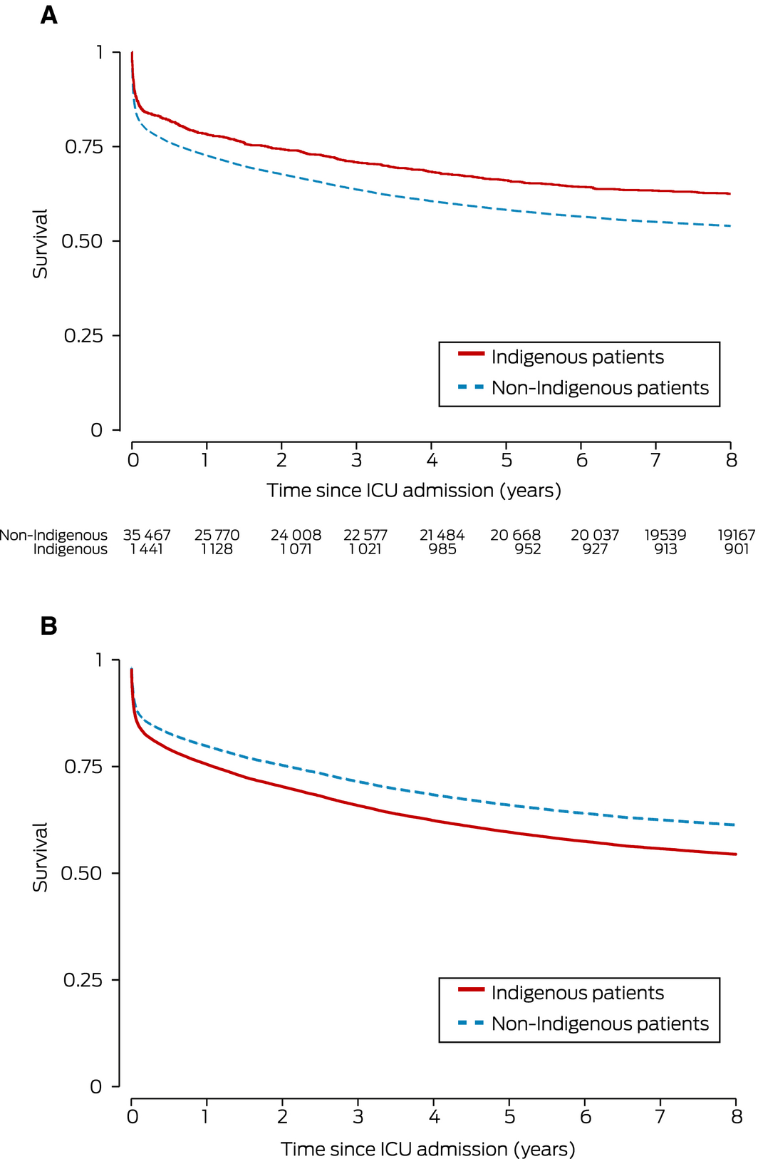 Results: 2035 of 39 784 non‐elective index ICU admissions (5.1%) were of Indigenous Australians, including 1461 of 37 661 patients with South Australian residential postcodes. The median age of Indigenous patients (45 years; IQR, 34–57 years) was lower than for non‐Indigenous ICU patients (64 years; IQR, 47–76 years). For patients with South Australian postcodes, unadjusted mortality at discharge and 12 months and 8 years after admission was lower for Indigenous patients; after adjusting for age, sex, diabetes, severity of illness, and diagnostic group, mortality was similar for both groups at discharge (adjusted odds ratio [aOR], 0.95; 95% CI, 0.81–1.10), but greater for Indigenous patients at 12 months (aOR, 1.14; 95% CI, 1.03–1.26) and 8 years (adjusted hazard ratio, 1.23; 95% CI, 1.13–1.35). The number of potential years of life lost was greater for Indigenous patients (median, 24.0; IQR, 15.8–31.8 v 12.5; IQR, 0–22.3), but, referenced to respective population life expectancies, relative survival at 8 years was similar (proportions: Indigenous, 0.78; 95% CI, 0.75–0.80; non‐Indigenous, 0.77; 95% CI, 0.76–0.78).