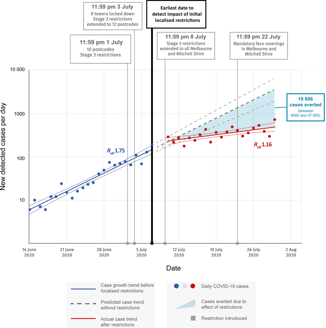 The model projected 27 000 cases (95% CI, 17 000–45 000) would occur from 1 to 30 July if the growth rate had continued unchanged (Reff 1.75), as opposed to the 8314 cases diagnosed in Victoria during this period.