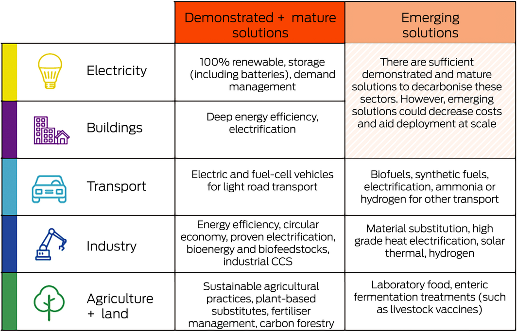 Australia is well placed to lead such a recovery as indicated in a recent report by ClimateWorks Australia,6 which provides a blueprint to achieve net zero emissions by 2050 through accelerated uptake of mature zero emission technologies and the rapid development and commercialisation of emerging zero emission technologies in harder to abate sectors (Box).