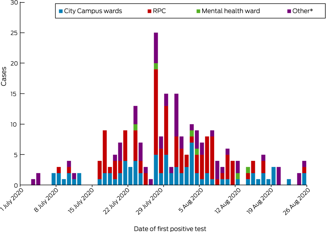 Box 2 – Epidemic curve of health care worker infections at the Royal Melbourne Hospital (1 July – 31 August 2020)