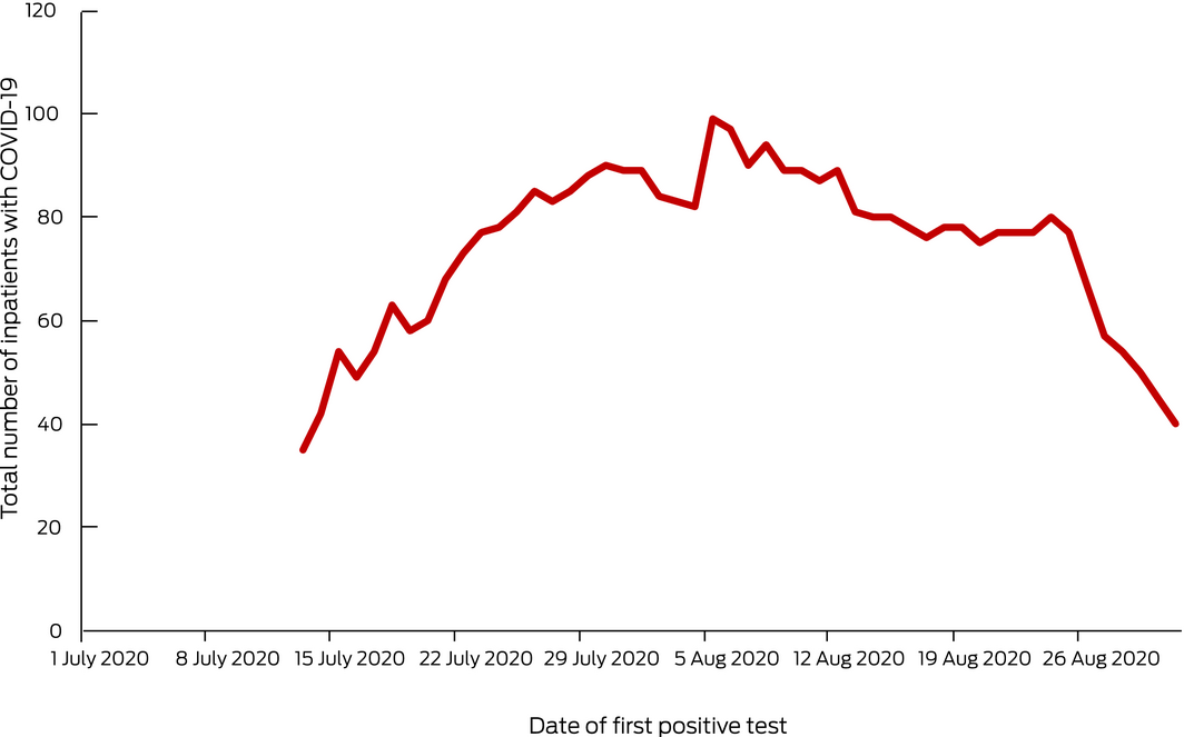 Box 3 – Prevalence of inpatients with coronavirus disease 2019 (COVID‐19) at both the Royal Melbourne Hospital City Campus and the Royal Park Campus over time (13 July – 31 August 2020)*