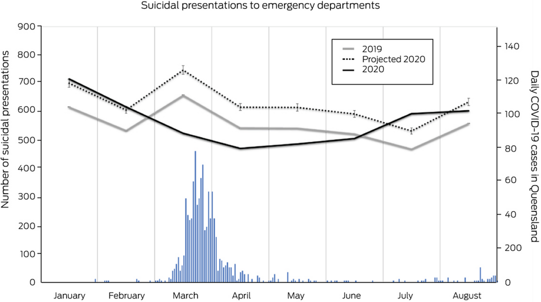 From March 2020 onwards, a marked divergence between observed and projected numbers is noted, corresponding to the oscillations in the numbers of diagnosed COVID‐19 cases in Queensland (Box). At the peak of the pandemic, the reductions in suicidal presentations were the largest (29.8% in March and 23.6% in April 2020). Over the next 2 months, daily numbers of diagnosed COVID‐19 cases remained low and the difference between observed and projected numbers gradually narrowed (20.8% in May and 14.6% in June 2020). In July 2020, observed numbers exceeded projected numbers by 11.4%, but then declined again in August 2020, coinciding with another resurgence of COVID‐19. Between March and August 2020, the Gold Coast Hospital and Health Service had 554 less suicidal presentations than expected.