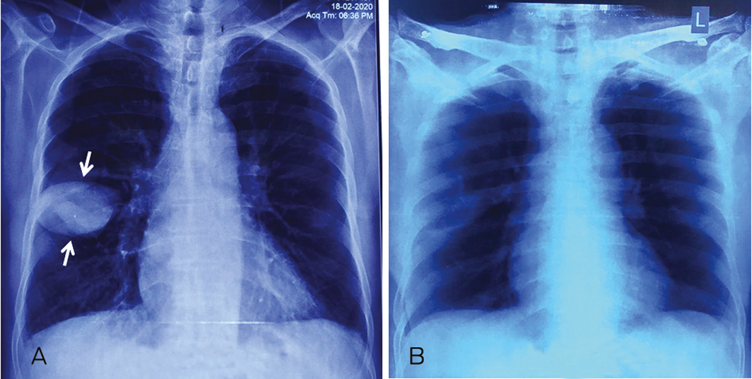 A 68‐year‐old man with diabetes presented with progressive dyspnoea of one month duration. On examination, he had atrial fibrillation with rapid ventricular response, raised jugular venous pressure, presence of pedal oedema, crepitations in chest, and left ventricular third heart sound. Chest x‐ray revealed a well defined oval shaped opacity (the “phantom tumour”) in the transverse fissure of the right lung (Figure, A; white arrows), which resolved completely after 4 days of diuretic therapy (Figure, B). Echocardiography revealed global hypokinesia of the left ventricle with a left ventricular ejection fraction of 28%. A phantom tumour is a localised collection of fluid in the lung fissures (mostly in the transverse fissure) in patients with heart failure.1 The underlying mechanism is thought to be repeated episodes of pleuritis.1
