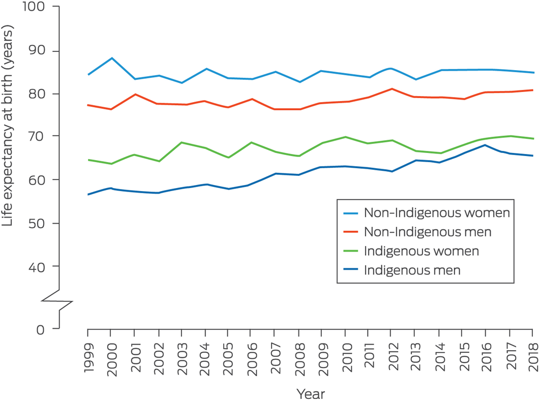 The new: In the Northern Territory, life expectancy increased more rapidly for Indigenous than non‐Indigenous people during 1999–2018, but the gap in life expectancy between the two groups remains considerable (15.4 years for both men and women).