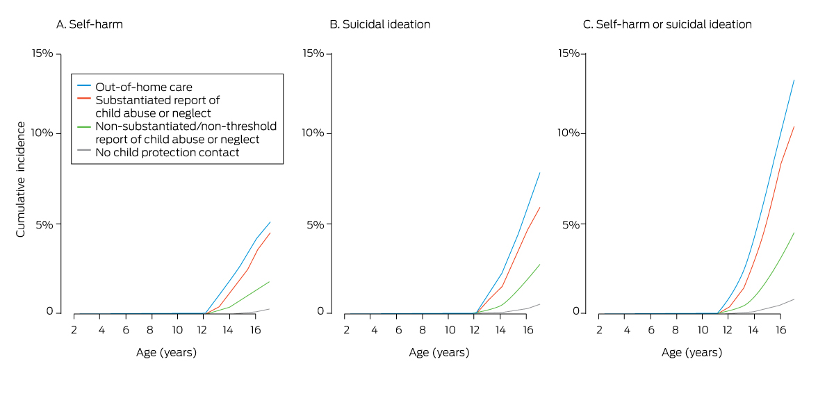 Self‐harm and suicide by young people are major problems,1 and they are more frequent among people known to child protection services,2,3 especially those placed in out‐of‐home care.4 We used record linkage to quantify the cumulative incidence of self‐harm and suicidal ideation in a population sample of New South Wales children and adolescents aged 0–17 years with differing levels of child protection contact during 2003–21.