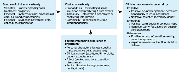More recently, different researchers have formulated frameworks that not only identify the types and sources of uncertainty, but also include factors that influence how much an individual clinician perceives uncertainty (eg, the clinical context or situation, personal moderators such as personality, cognitive capacity, level of experience, sociocultural influences), and categorise how individuals respond to uncertainty in cognitive, emotional and behavioural terms, both positive and negative.27,28,29 In Box 2, we have constructed a schema that integrates these various frameworks, while noting that dimensions of probability, ambiguity and complexity can be difficult to disentangle, and boundaries between source domains of scientific, practical and personal, and between response domains of cognitive, emotional and behavioural are blurry and often intertwined.