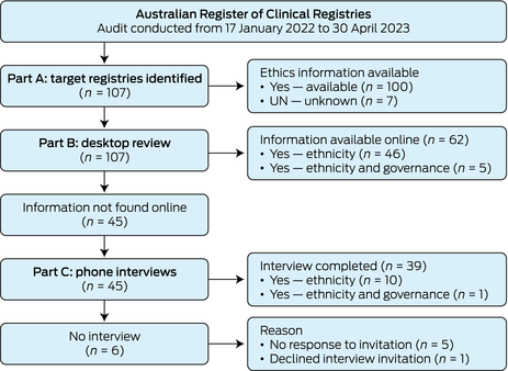 This audit involved a review of all registries in the ARCR from 17 January 2022 to 30 April 2023. General registry demographics were collected from the ARCR: registry establishment year, clinical domain, geographical coverage (international, national, etc), and ethics approval body. Examination of IG‐Data was undertaken by identifying if and how registries collected participant ethnicity, if ethics approval was provided and by whom, and if there was Indigenous representation on registry governance or steering committees. Ethnicity, rather than Indigenous status, as an item was investigated, because Indigenous status is commonly embedded in ethnicity as a data item in registries. The registry audit was conducted over three parts (Box 1): target registries were identified in Part A, identified registries were examined by desktop review in Part B, and registries moved to Part C of the audit (phone interviews) if ethnicity item reporting was not found during the desktop review.