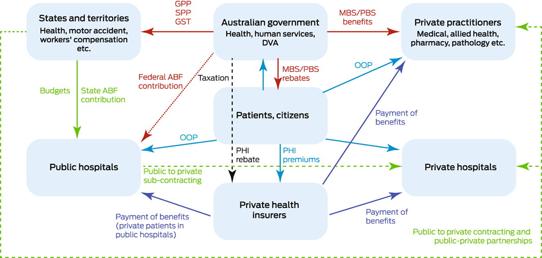 ABF = activity‐based funding; GPP = general purpose payments; GST = goods and services tax; MBS = Medicare Benefits Schedule; OOP = out‐of‐pocket expenses; PBS = Pharmaceutical Benefits Scheme; PHI = private health insurance; SPP = specific purpose payments.