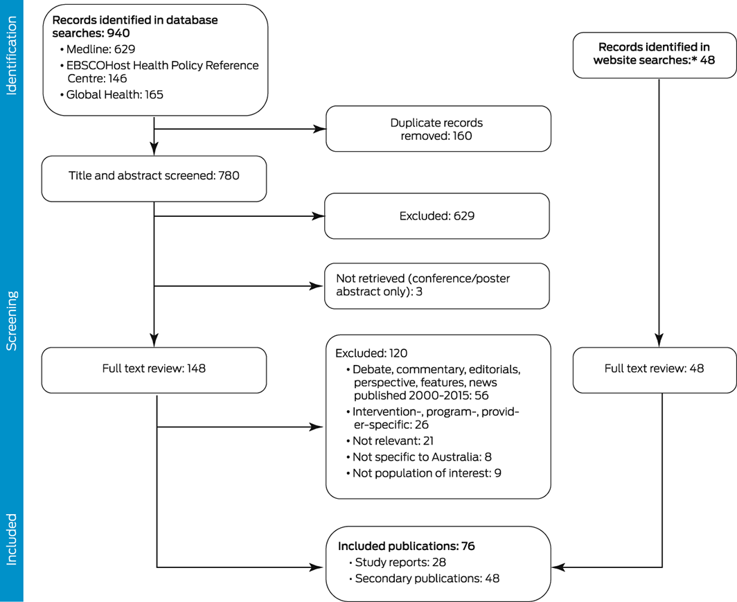 Our database search identified 940 potentially relevant publications; after screening and full text review, 28 study reports were deemed eligible for our review. A further 48 items identified by website searches were also included (Box 2; Supporting Information, part 2). We identified seven major themes in the included articles (Box 3).