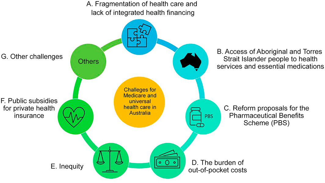 Results: The problems covered by the 76 articles included in our review could be grouped under seven major themes: fragmentation of health care and lack of integrated health financing, access of Aboriginal and Torres Strait Islander people to health services and essential medications, reform proposals for the Pharmaceutical Benefits Scheme, the burden of out‐of‐pocket costs, inequity, public subsidies for private health insurance, and other challenges for the Australian universal health care system.