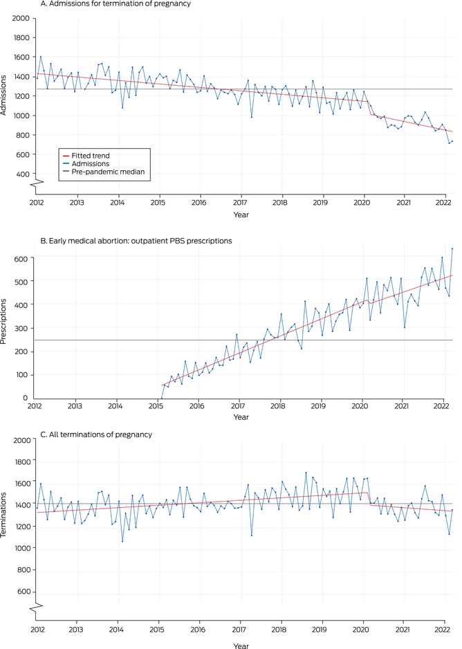 Our findings also suggest that mifepristone–misoprostol is increasingly the preferred method for early abortion; as is already the case in some European countries,18 we anticipate that outpatient abortions will eventually outnumber first trimester abortions in hospitals. The recent removal of restrictions on mifepristone–misoprostol prescribing and dispensing23 and the recommended retention of MBS telehealth items for reproductive health care (including termination care)1 will support this change, and also enhance the resilience of reproductive health care services during future emergencies.